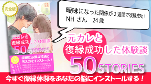 | 元カレとの復縁に成功したという体験談が50個ほど掲載されており、あなたの場合にも当てはまるものが、きっとあると思います。いろんな復縁の成功事例から学ぶことで、復縁はけっして不可能なことではないという気持ちを持たせてくれます。 | ||||